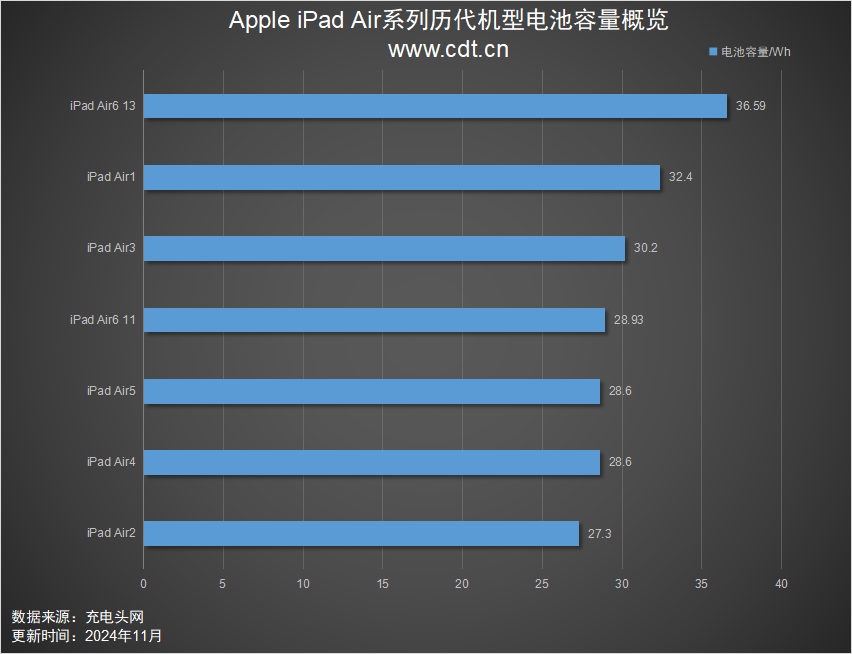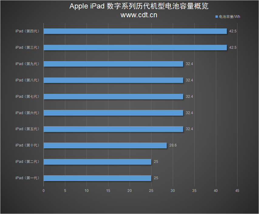 可以从柱形图中清晰看到,一代与二代电池容量相当,为25Wh;三代与四代电池容量相当,为42.5Wh;五代至九代电池容量相当,为32.4Wh;而最新的第十代iPad电池容量缩减至28.6Wh。