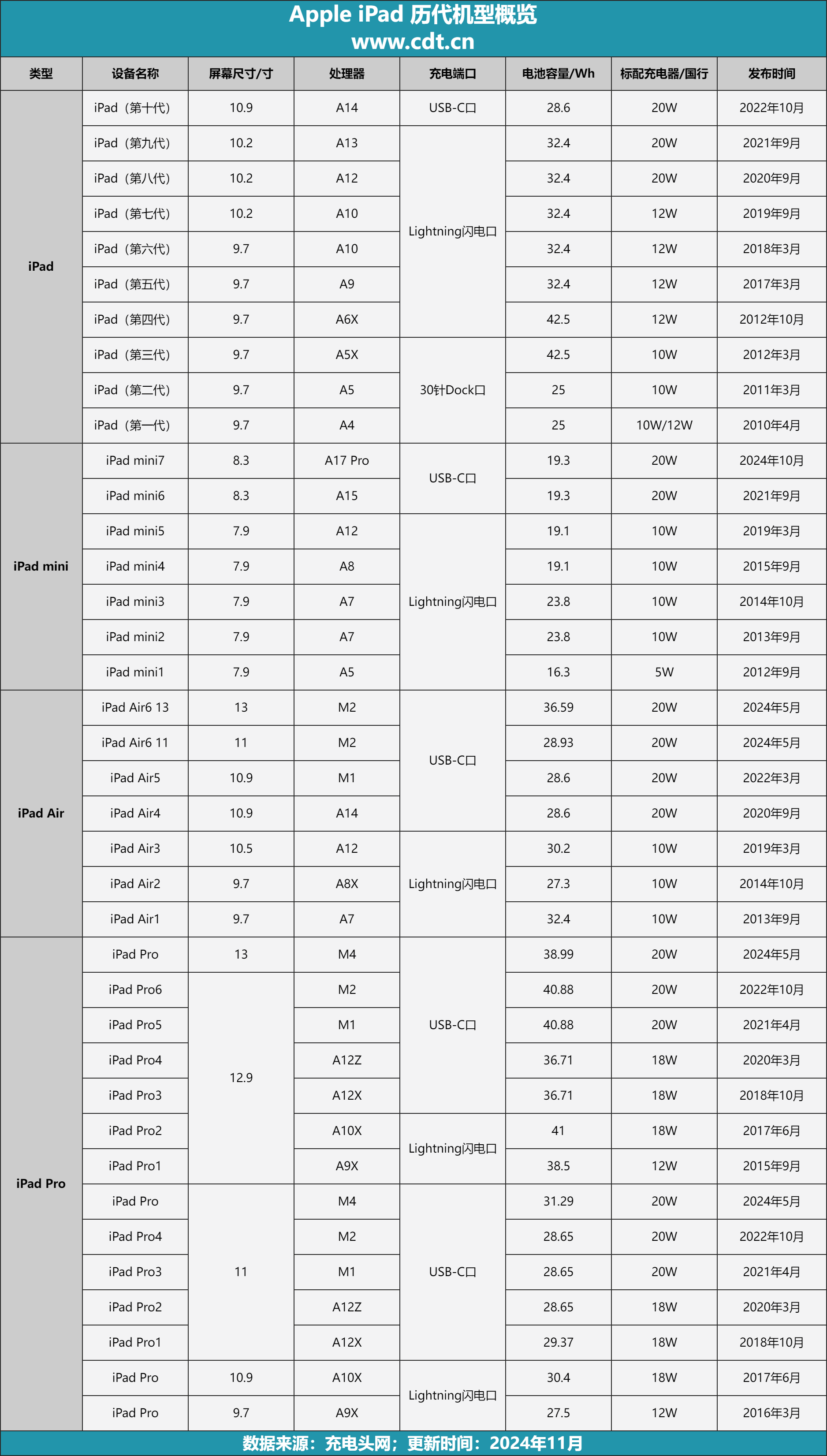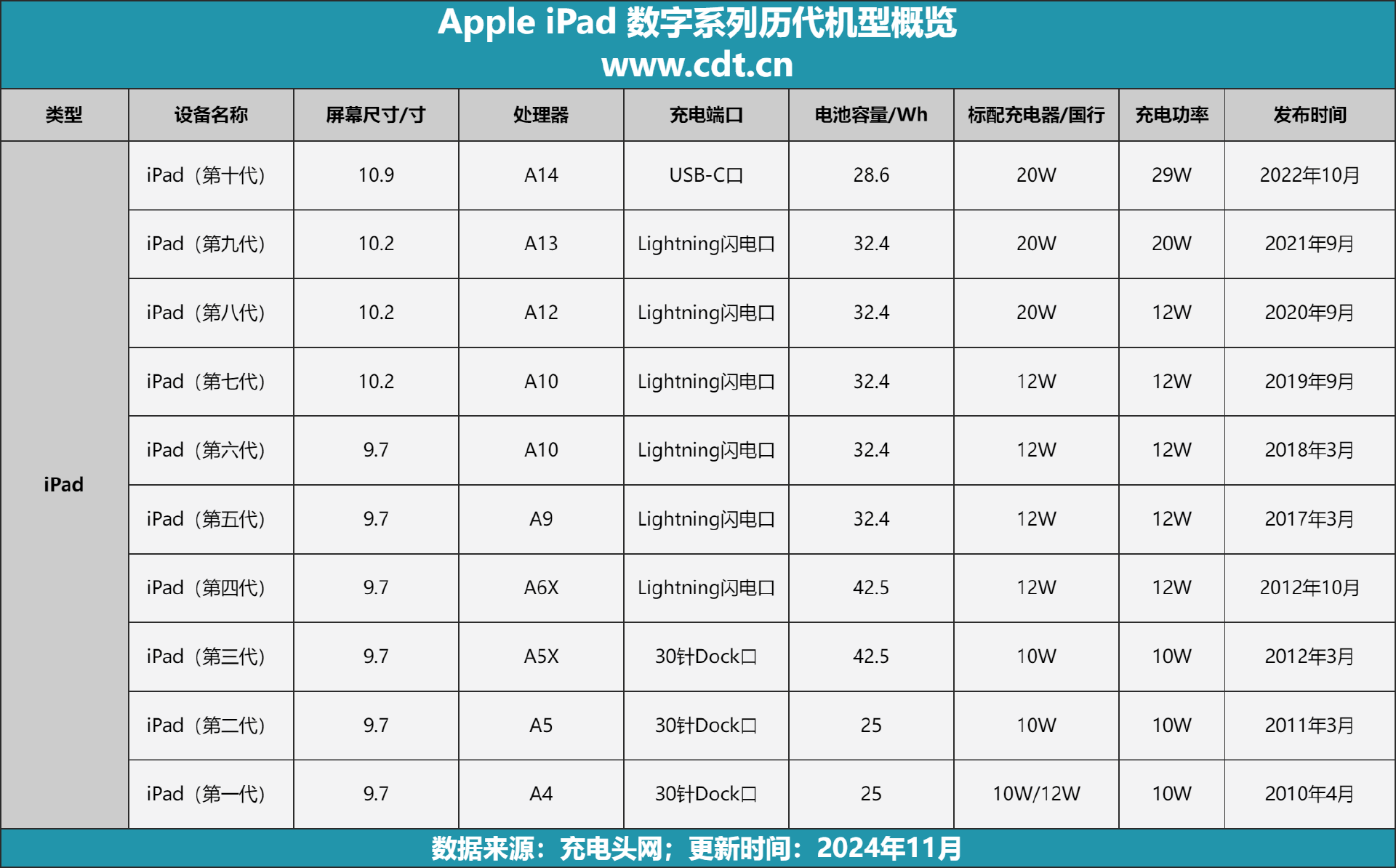 “买前生产力,买后爱奇艺”已经成为平板电脑的专用标语了,但随着互联网及科技的发展,让它与手机、笔电设备的定位更为清晰。作为“引领者”的iPad,拥有众多产品线,它所拥有更大的屏幕、电池及处理器性能,因此可以承担一些轻度工作,丰富娱乐生活,但续航仍旧是用户需要面临的最大问题。此次,充电头网将对苹果旗下的iPad机型进行分析汇总,看看历代的iPad的电池容量变化如何。