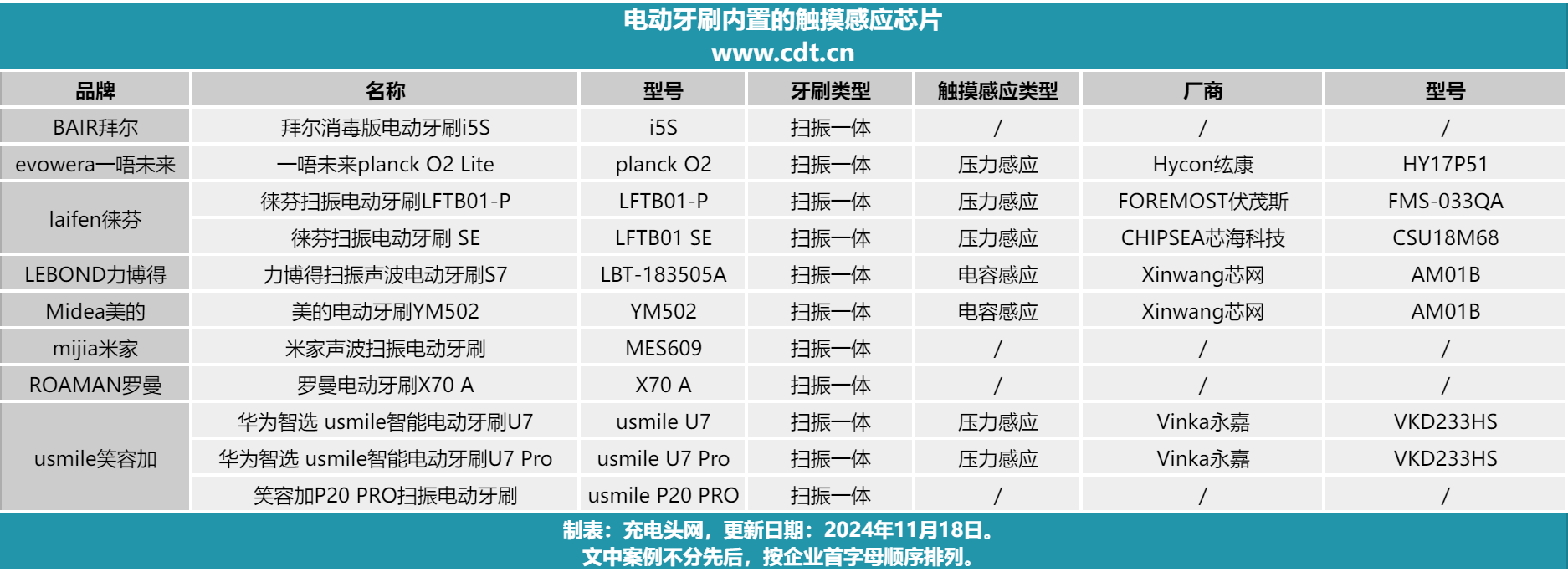 为探究扫振一体电动牙刷中广泛应用的触摸感应芯片,充电头网整理了以往那些内置此类芯片的拆解案例,看看有哪些电动牙刷内置触摸感应芯片。