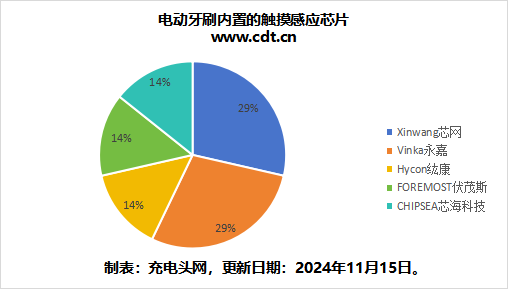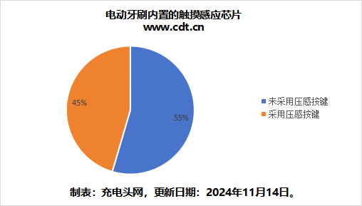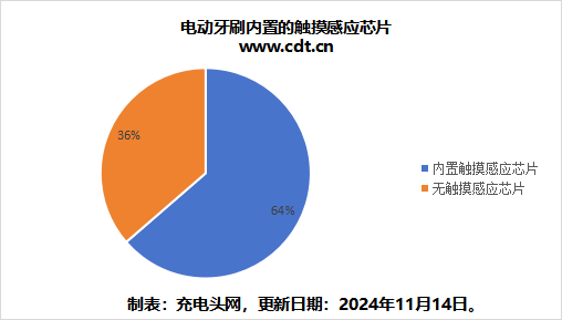 将文中电动牙刷触摸感应芯片占比绘制成饼图,可见超半数的产品内置触摸感应芯片。