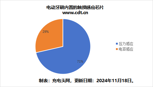 将文中电动牙刷触摸感应类型占比绘制成饼图,可见超半数内置触摸感应芯片的产品采用压力感应。