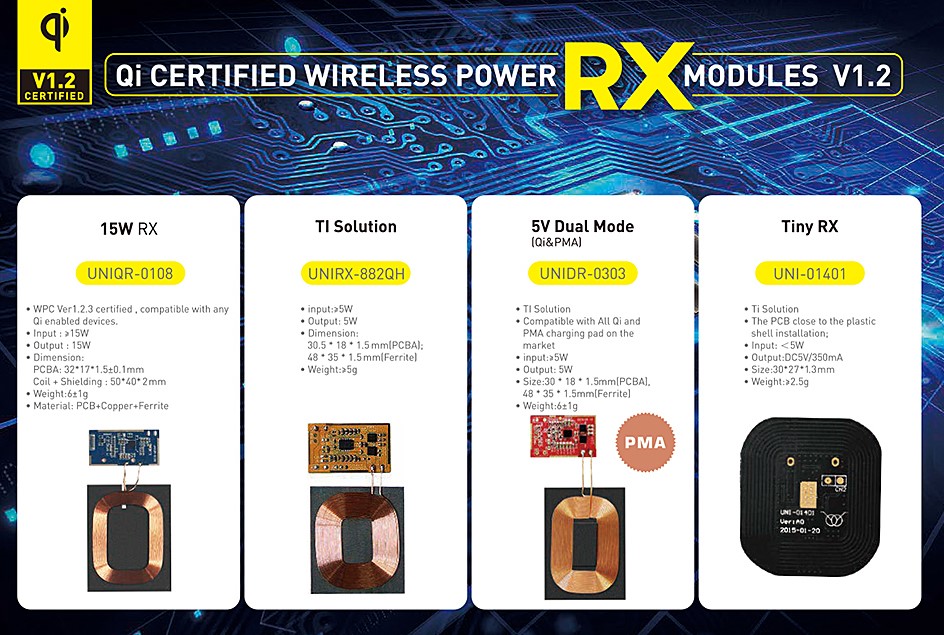 5、方案齐全,多元化选择:佑骅提供各种不同应用之专业模块,从5W、10W、15W到30W之发射与接收模块,适用于各类消费性电子,手持配件,健康医疗设备,手机平板配件,穿戴式配件,小型工具机,甚至是家具,灯饰,精品皮包,制鞋业等传统行业皆能结合应用。