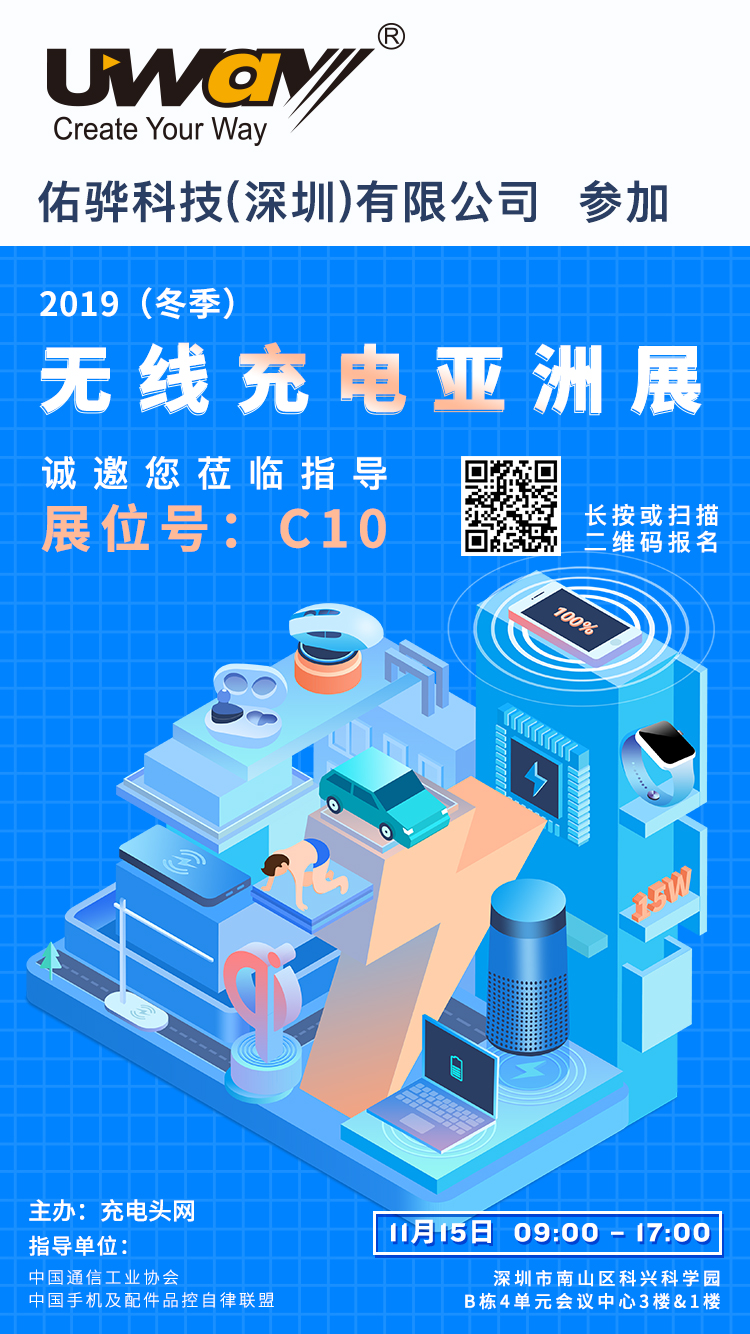 温馨提示:佑骅科技 将参加11月15日中国深圳召开的2019(冬季)无线充电亚洲展,展位设在C10,需要了解无线充ODM/OEM服务的观众,可在展会当天前往展位详细交流。
