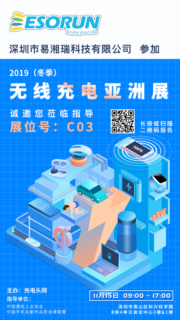 温馨提示:易湘瑞 将参加11月15日中国深圳召开的2019(冬季)无线充电亚洲展,展位设在C03,需要了解无线充ODM/OEM服务的观众,可在展会当天前往展位详细交流。