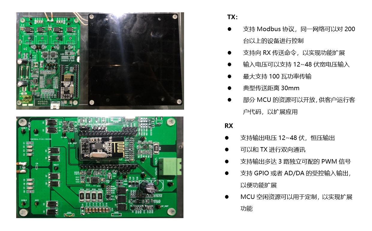 中小功率无线充并不是华润矽科无线充探索的终点,矽科仍旧积极的探索中大功率及超大功率3.3KW汽车应用的可能性,目前中大功率已经取得了实质的进展,功率覆盖30-100W。目前支持Modbus协议,未来可支持Bluetooth或者Wifi等网络通讯功能实现更广泛的互联。