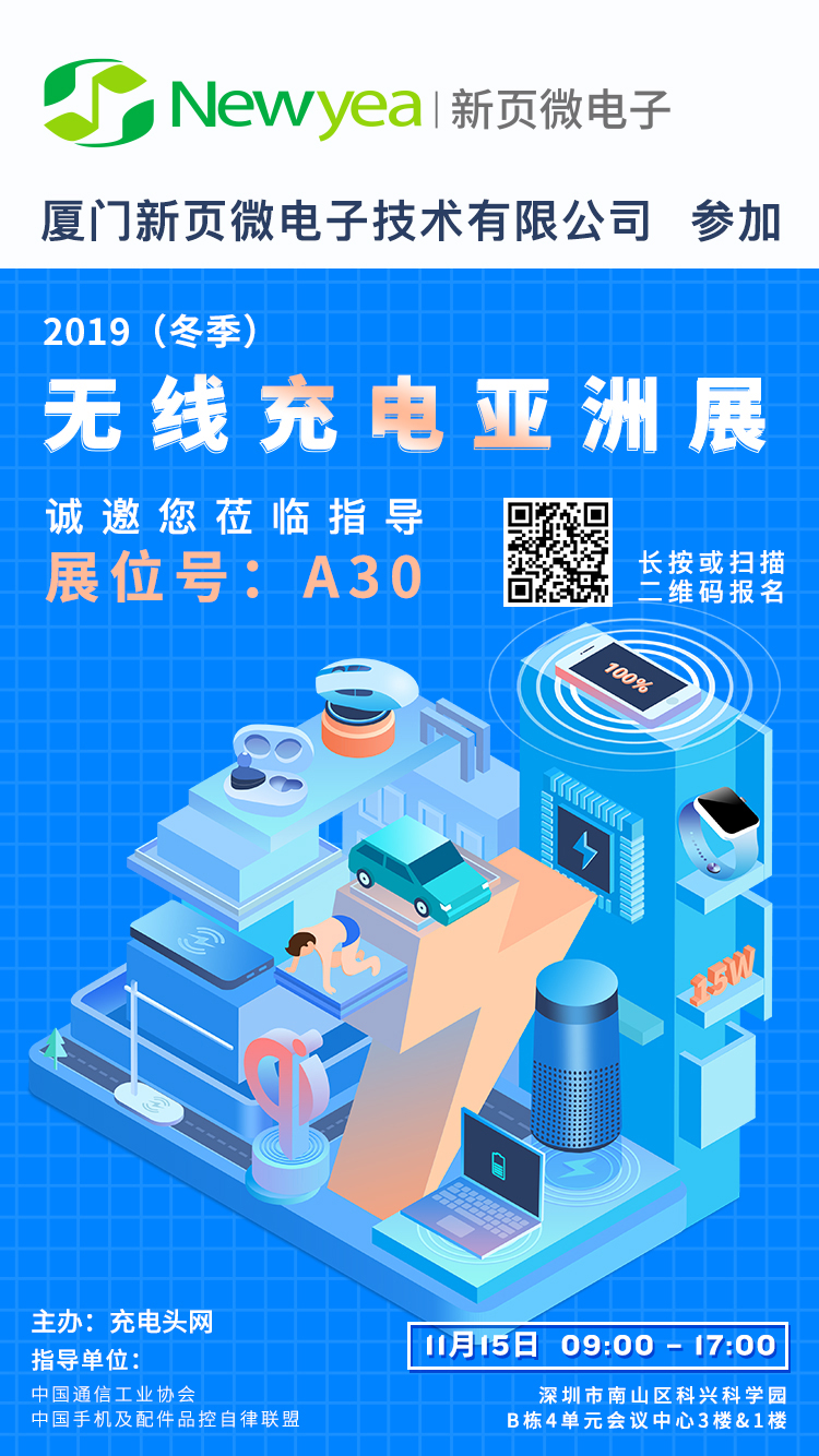 温馨提示:新页微电子 将参加11月15日中国深圳召开的2019(冬季)无线充电亚洲展,展位设在A30,需要了解无线充电解决方案的观众,可在展会当天前往展位详细交流。