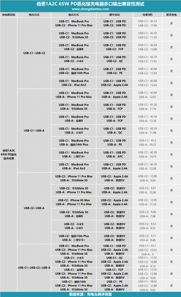 小编还测试了其余的一些数码设备,制成如上表格。可以看到倍思65W氮化镓充电器在多口同时输出的状态下,给iOS13.1.2系统版本的iPhone充电不会拒充,看来苹果是在iOS13.1.2的系统版本中作出了修复。倍思1A2C 65W PD氮化镓充电器在多口输出时,都能为测试设备充电,没有发生拒冲重启现象。