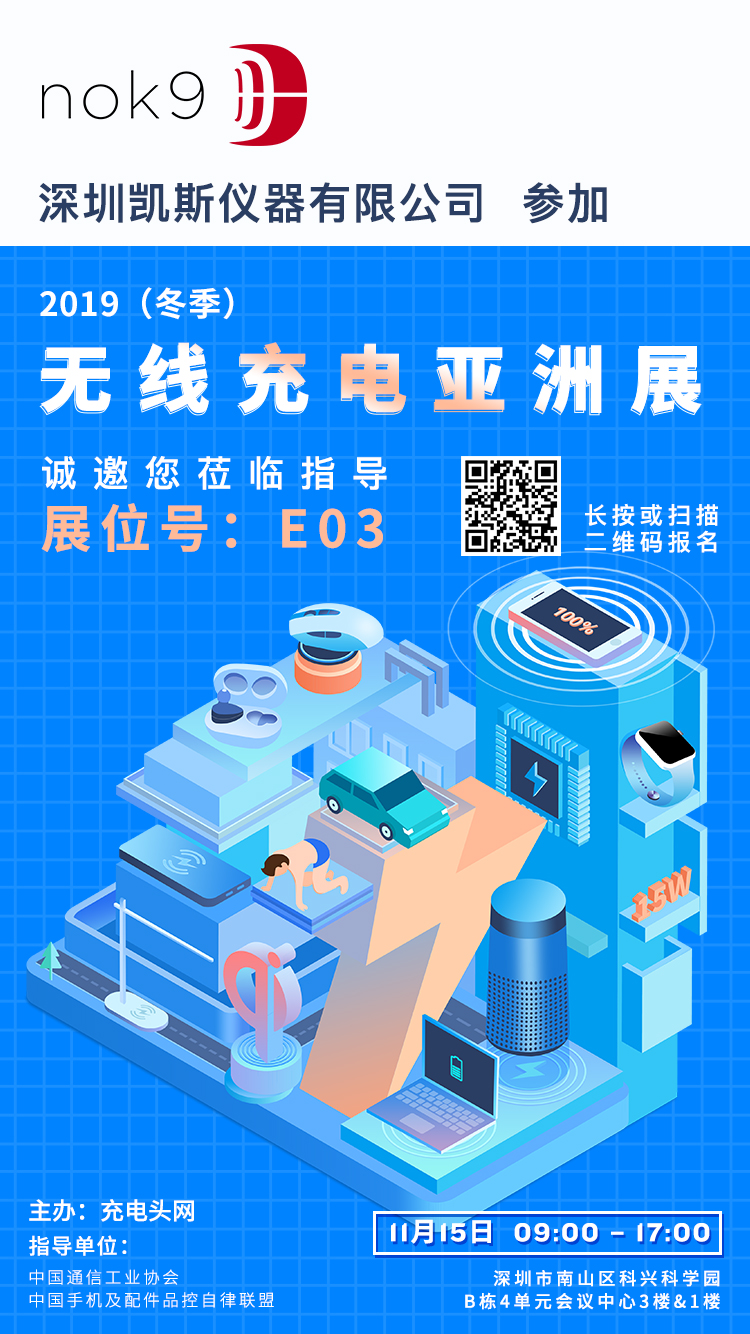 温馨提示:nok9 将参加11月15日中国深圳召开的2019(冬季)无线充电亚洲展,展位设在E03,需要了解无线充电测试系统的观众,可在展会当天前往展位详细交流。