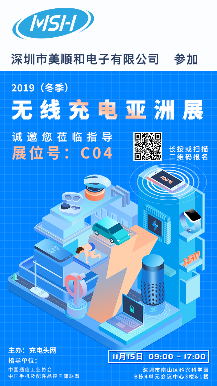 温馨提示:美顺和 将参加11月15日中国深圳召开的2019(冬季)无线充电亚洲展,展位设在C04,需要了解无线充ODM/OEM服务的观众,可在展会当天前往展位详细交流。