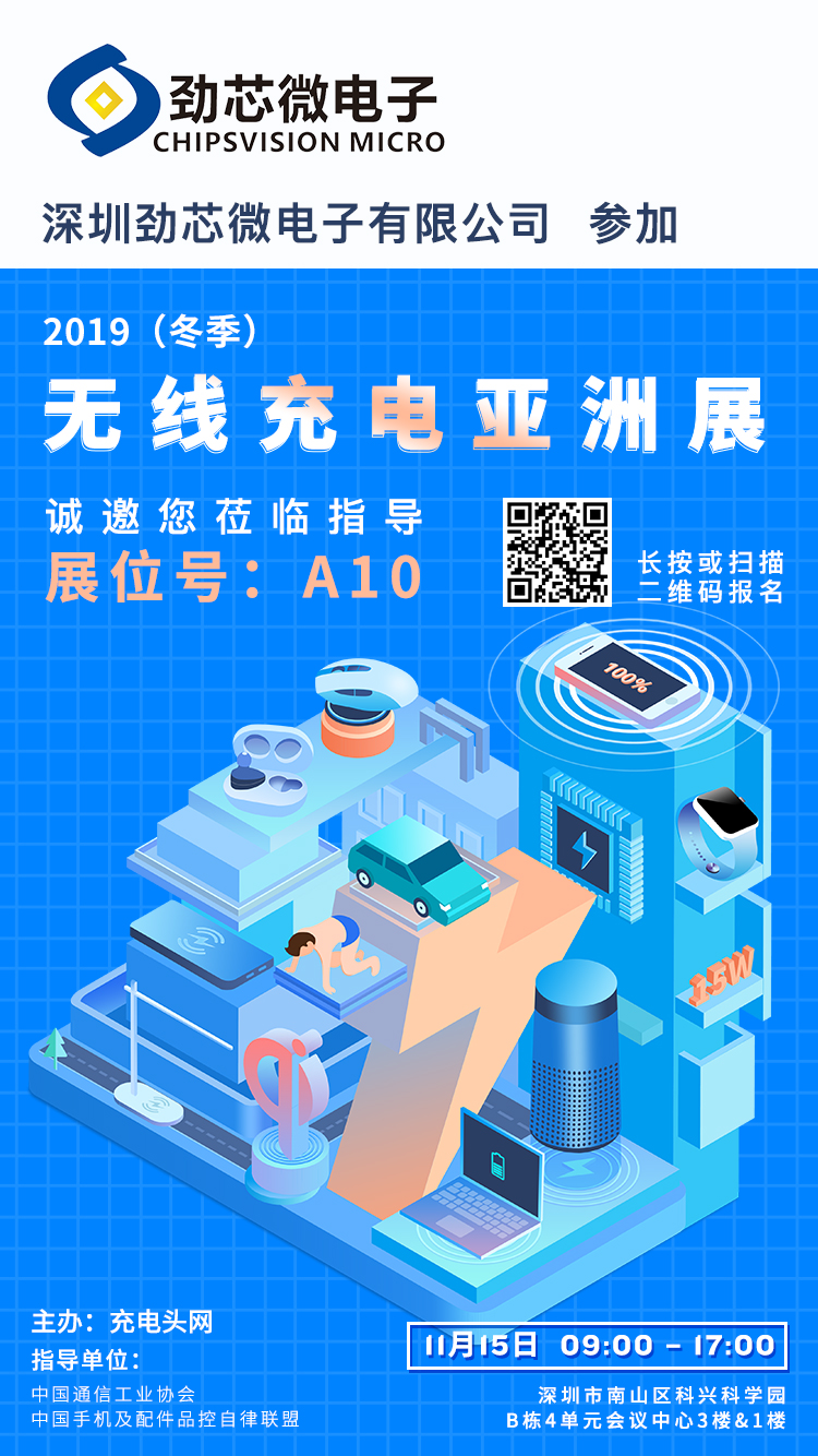温馨提示:劲芯微 将参加11月15日中国深圳召开的2019(冬季)无线充电亚洲展,展位设在A10,需要了解无线充电TX/RX解决方案的观众,可在展会当天前往展位详细交流。