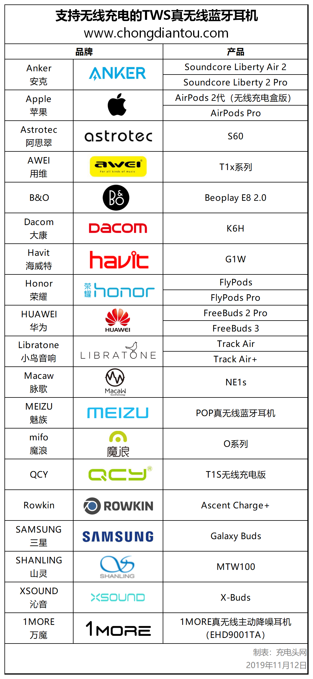 我们搜集市面支持无线充电的TWS耳机,最新数字是截止2019年11月,已有19家热门品牌推出了24款搭载无线充电的TWS耳机,包括:Anker、苹果、阿思翠、用维、B&O、大康、海威特、荣耀、华为、小鸟音响、脉歌、魅族、魔浪、QCY、Rowkin、三星、山灵、沁音、1MORE万魔等。当然这还只是热门品牌,市面支持无线充的TWS耳机真实数量远超这一数字。