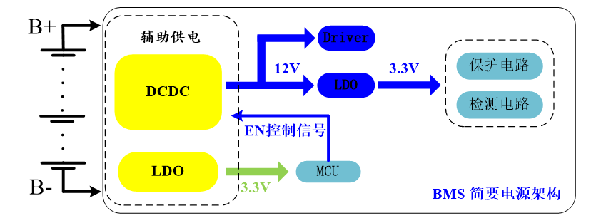 由于传统的高压DC-DC普遍待机>300µA,加之系统的损耗很难满足<400µA的标准。所以为了实现BMS的低待机问题,应用工程师往往需要给BMS做两路供电:低待机的LDO +高压DC-DC,如下图所示。LDO一直出3.3V给MCU供电,保证工作和待机时MCU工作稳定,以便待机时MCU能够关掉DC-DC;DC-DC提供更大的能量保证系统在工作时其它部分的用电。