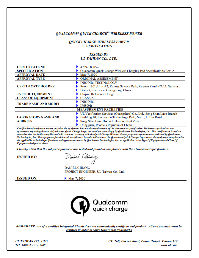 目前,测试实验室UL已被授权对Quick Charge合规认证计划进行监管。