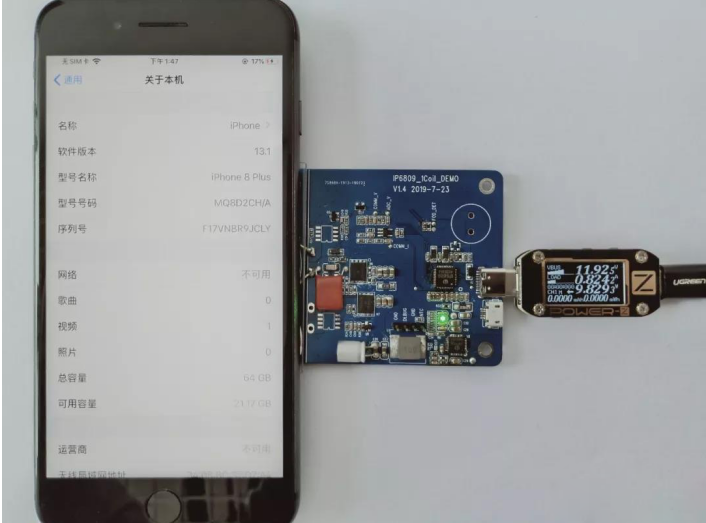 通过此次合作,IP6809的兼容性更加强大,同时支持Quick Charge 3.0输入,以及PD输入,支持苹果定频调压解决方案实现苹果iOS13.1系统全速快充,如下图所示: