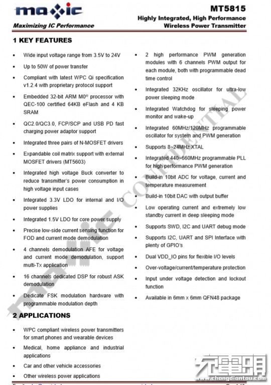 美芯晟MT5815资料信息。该芯片的更多特色性能,充电头网此前已经在《美芯晟MT5815:集成USB-PD协议的50W高效率无线充电发射芯片方案》文章中有过详细的介绍。