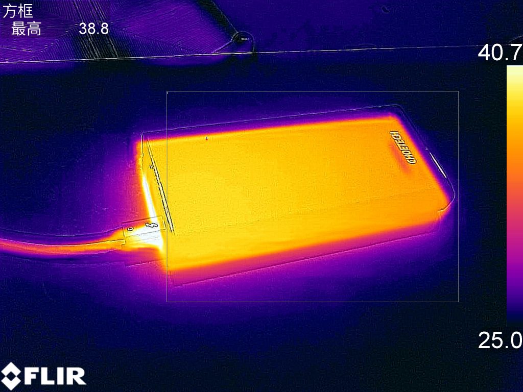 对移动电源的温升进行测试,测试条件为在约25°的室温条件下以20V3.25A 65W的功率持续输出一小时进行测试,一小时过后使用FLIR热成像仪测得移动电源表面的温度为38.8°,刚刚超过人体的正常温度,摸上去感觉不到温度,这样的温度表现也是和表面采用金属机身有关。