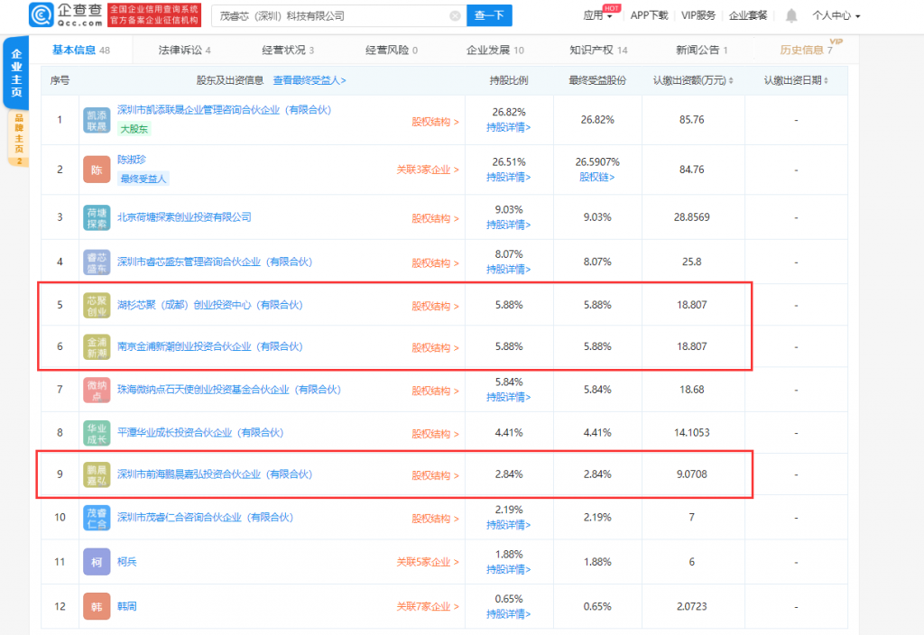 充电头网通过企查查了解到,茂睿芯科技近期发生了股权变更,湖杉芯聚(成都)创业投资中心,南京金浦新潮创业投资合伙企业、深圳市前海鹏晨嘉弘投资合伙企业三家基金均向茂睿芯科技入股,持股比例分别为5.88%、5.88%和2.84%。