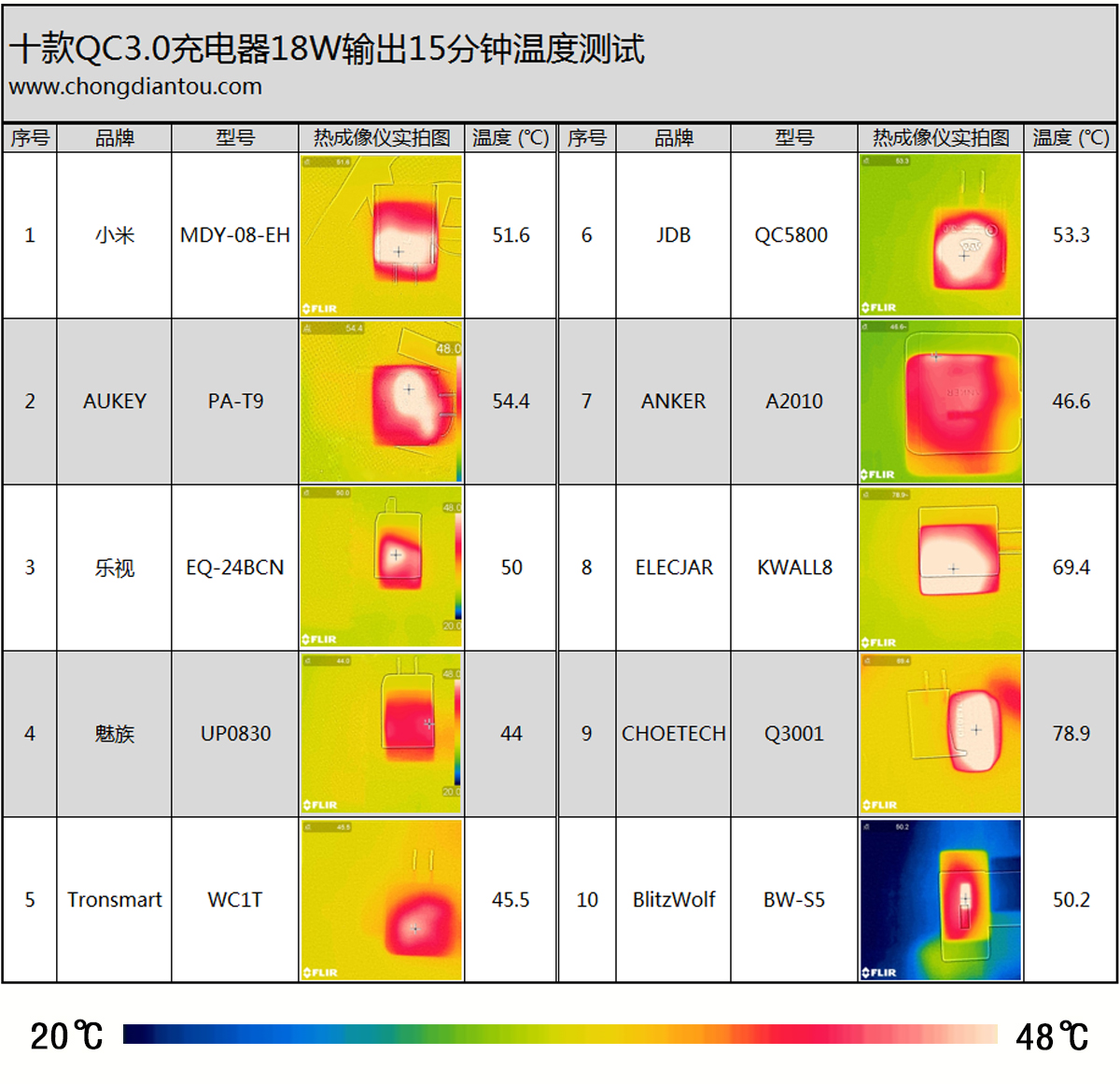 温度测试是对充电器能量转换效率、散热能力的综合考量。在室温环境下,充电器以最大功率9V*2A=18W输出15分钟后,使用FILR ONE 二代热成像仪检测充电器的温度,温度越低代表充电器的能量转换效率、散热能力越好,越节能、越安全。