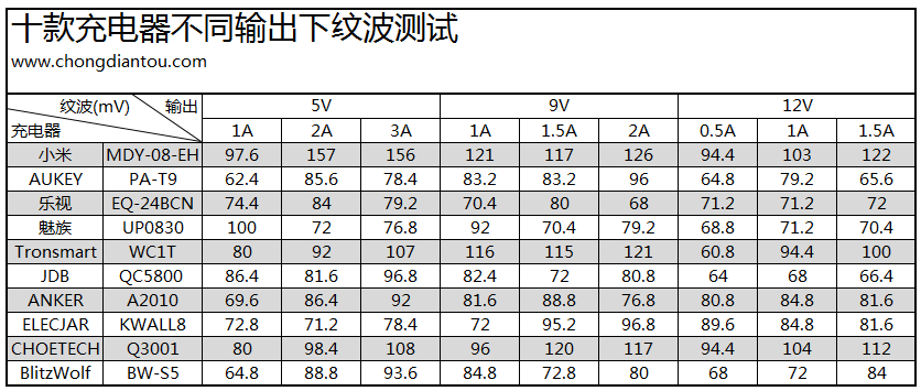 以220V交流为输入电压,分别测试各充电器在5V(1A/2A/3A)、9V(1A/1.5A/2A)、12V(0.5A/1A/1.5A)下的纹波值。统计结果如下: