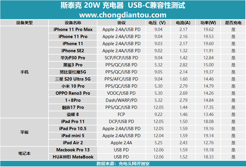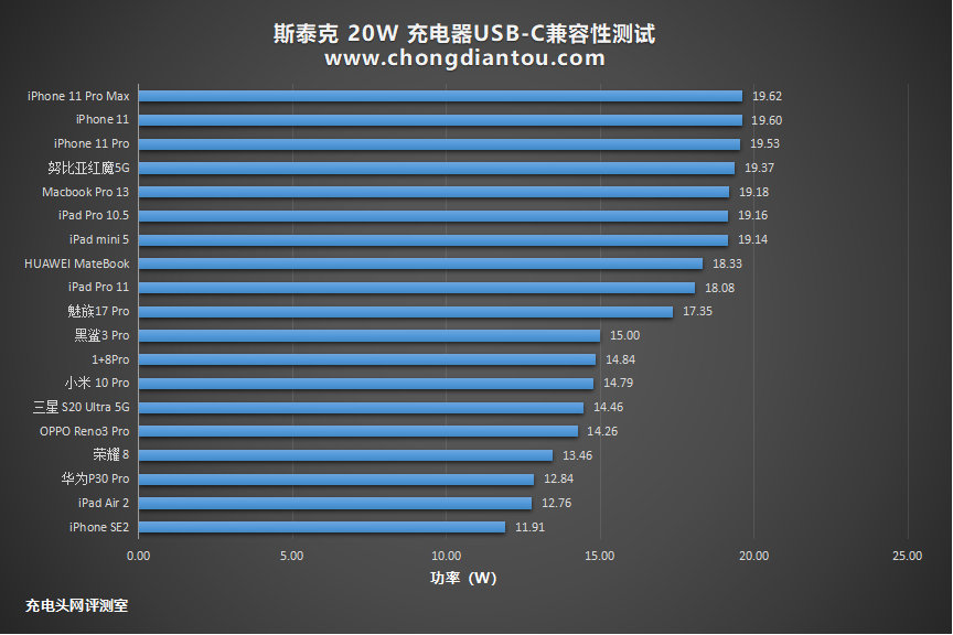 为了更直观的分析数据,我们将其制作成柱状图,其中三款iPhone11系列手机名列三甲,其他设备紧随其后,但差距并不大。根据数据总结,斯泰克 20W 充电器最大的特点是稳定,其次就是兼容性。