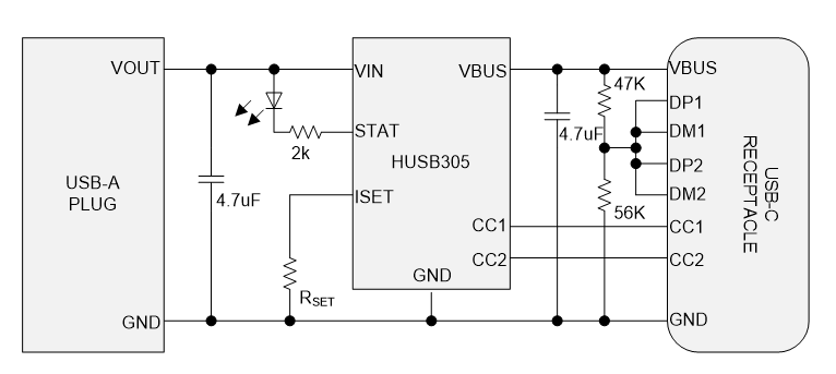 HUSB305是一款内置负载开关的USB Type-C 5V3A DFP控制器,适用于替代传统的桶形连接器(Barrel Connector)或USB micro-B 连接器供电的电子设备,如手机、平板电脑、路由器、数字音箱、电动剃须刀、机顶盒和其他可充电设备。HUSB305的特性如下: