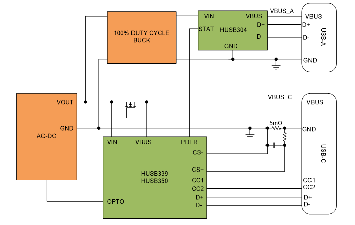 图8. HUSB304和HUSB350搭配的1A1C双口PD参考框图