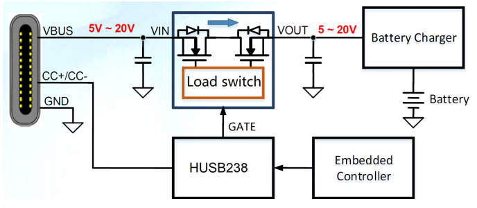 HUSB238系统图如图5所示。HUSB238与USB PD Source通信,通过USB-C连接器实现USB Type-C和PD握手。HUSB238能够控制负载开关,实现VBUS过压保护、欠压保护、过流保护和反向电流阻断。嵌入式控制器可以通过I2C接口访问HUSB238进行监控和高级设置。