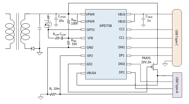 XPD738应用在1C1A双端口充电设备,在A口连接苹果充电线但未接入苹果手机时,C口仍然有快充。XPD738秉承云矽全集成设计思路,也集成了10mΩ VBUS通路功率开关管和10mΩ电流检测电阻。对于1C1A 20W配置的充电设备,XPD738是当之无愧的不二之选。