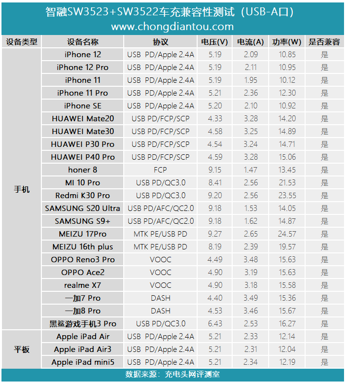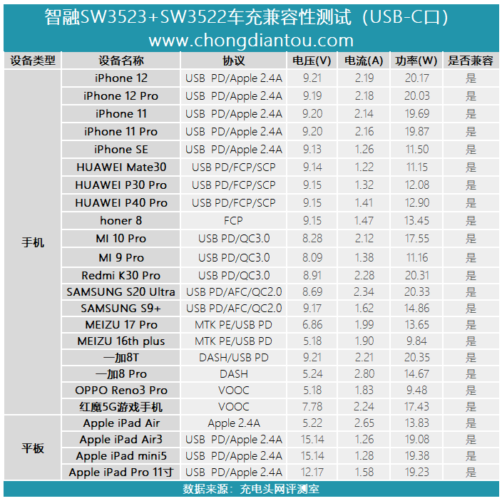 这套车充方案的USB-C接口有智融SW3522芯片控制,该芯片不仅实现了对USB PD快充协议的兼容,而且还针对iPhone 12系列20W快充进行优化,实测可以兼容苹果、华为、小米、三星、魅族、一加等品牌手机以及品牌快速充电。