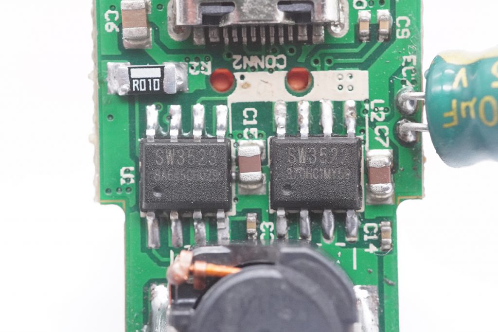 两颗芯片分别为智融的SW323和SW3522,其中SW3523负责USB-A口的降压控制和协议识别;SW3522负责USB-C接口的降压控制和协议识别,两路互相独立输出,支持同时快充。