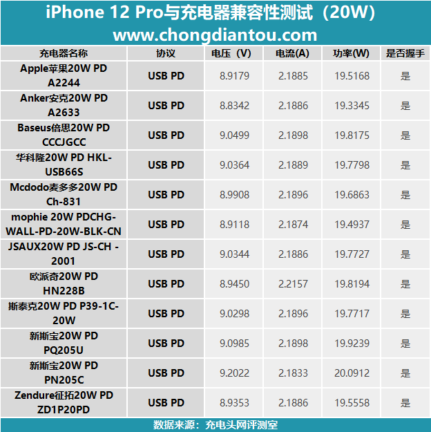 为了方便大家查阅,我们将iPhone 12 Pro与20W PD充电器的兼容性测试整理到表格中。所有充电器都握手快充不必再提,这些20W PD充电器多为 9V 2.22A模式,充电功率都在20W上下。