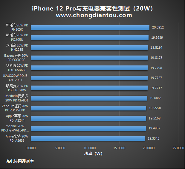 本次iPhone 12 Pro与充电器兼容性测试在20W功率段共使用了12款PD充电器,体积大小都有,品牌也涵盖了海内外知名品牌,以下是本次测试得出的结论: