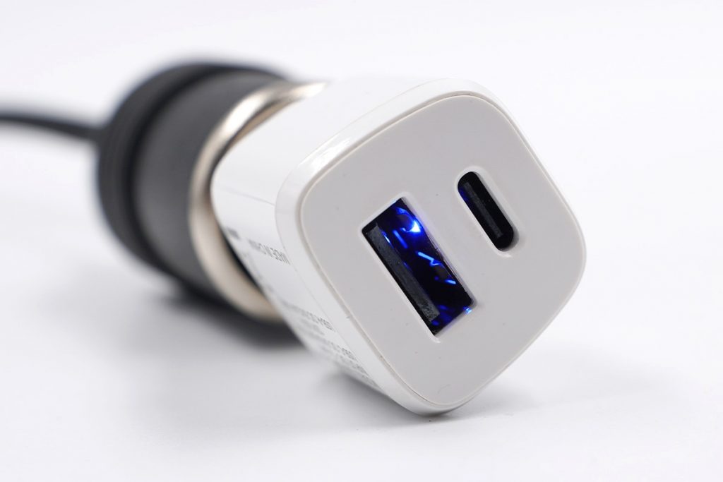 中正仁和32W 1A1C车载充电器拥有双输出接口,分别是一个用于给数码产品作主力供电的USB-C PD快充输出口,一个用于给行车记录仪或数码产品供电的副输出口。车充内部带有LED,通电后会从接口透出蓝光,便于用户在黑暗环境中寻光插入。