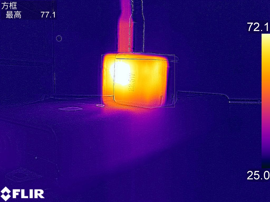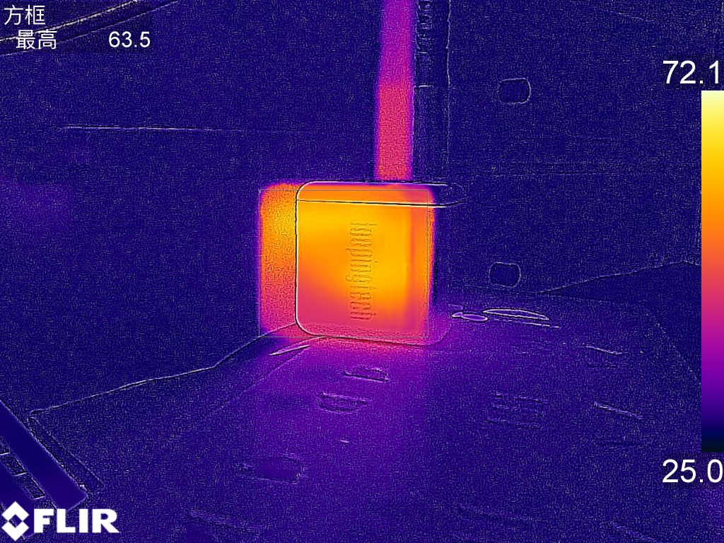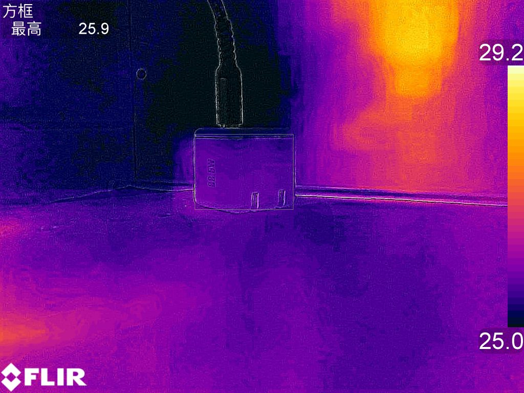 对龙冰22.5W PD充电器的温升进行测试,测试条件为在温度约为25℃的恒温箱内以12V 1.8A 22W的功率持续输出一小时进行测试。准备开始测试前,最高温度为25.9℃。