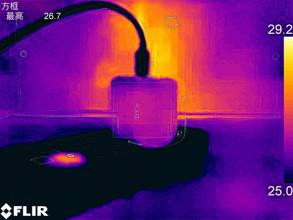 对Benks 65W 1C1A氮化镓充电器的温升进行测试,测试条件为以20V 3.25A 65W的功率持续输出一小时进行测试。准备开始测试前,最高温度为26.7℃。