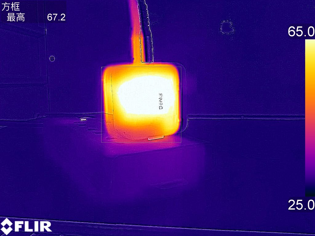 目前国家标准中对充电器表面温度要求是,不高于95度,Benks 65W 1C1A氮化镓充电器测试最高温度仍比国家标准低不少,这些温度都是符合安全使用标准的。