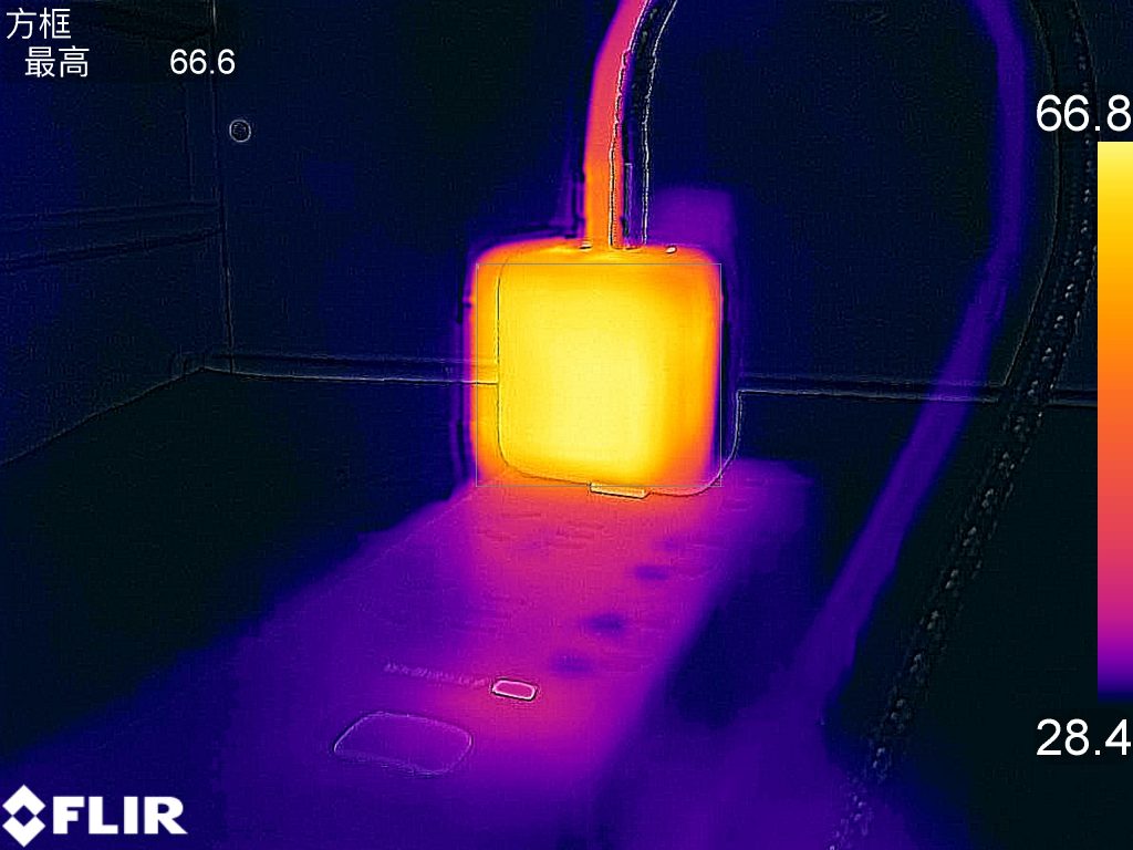 作为参照,满载一小时测试中,低功率密度的氮化镓充电器满载温度一般在60-70度之间,而高功率密度的单口氮化镓充电器一般在70度左右,高功率密度的多口氮化镓充电器温度一般都会超过70度。