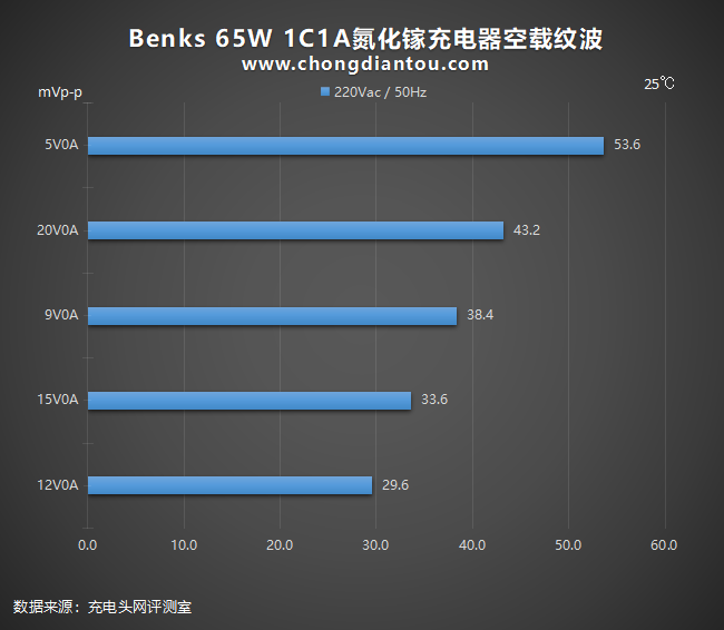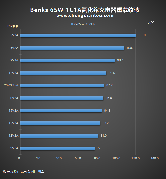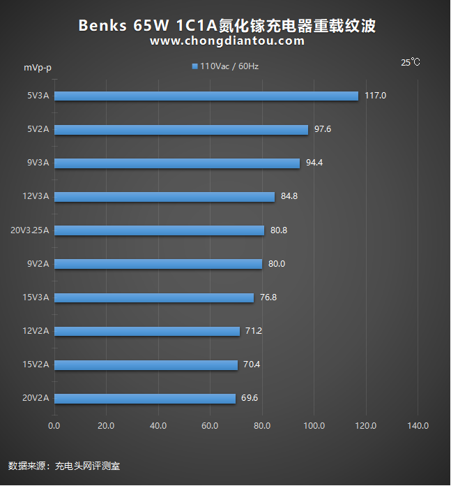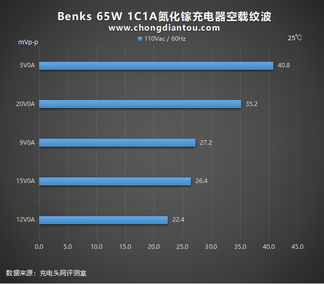 国家标准中充电器纹波要求是不高于200mVp-p,Benks 65W 1C1A氮化镓充电器在110V 60Hz、240V 50Hz输入电压下,所有输出功率纹波峰峰值均低于200mVp-p这个标准很多,表现不错。