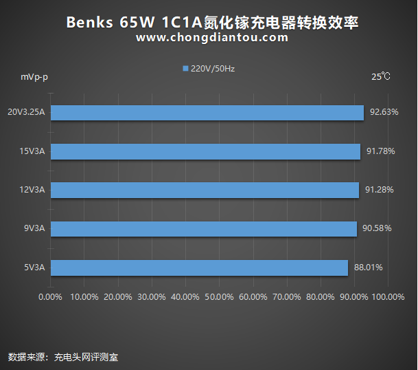 充电器本质上是一种转换设备,过程中会有损耗,以热量的形式散发出来。转换效率指的是充电器输出功率和输入功率的比值,也就是对电能的利用效率,转换效率越高越省电。Benks 65W 1C1A氮化镓充电器在110V 60Hz和220V 50Hz交流输入的各个电压档位下共测试出十个数据,从88.01%到92.63%不等,表现不错。