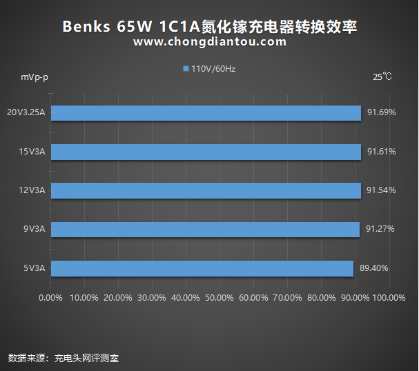 110V 60Hz下,充电器的转换效率从89.4%到91.69%。