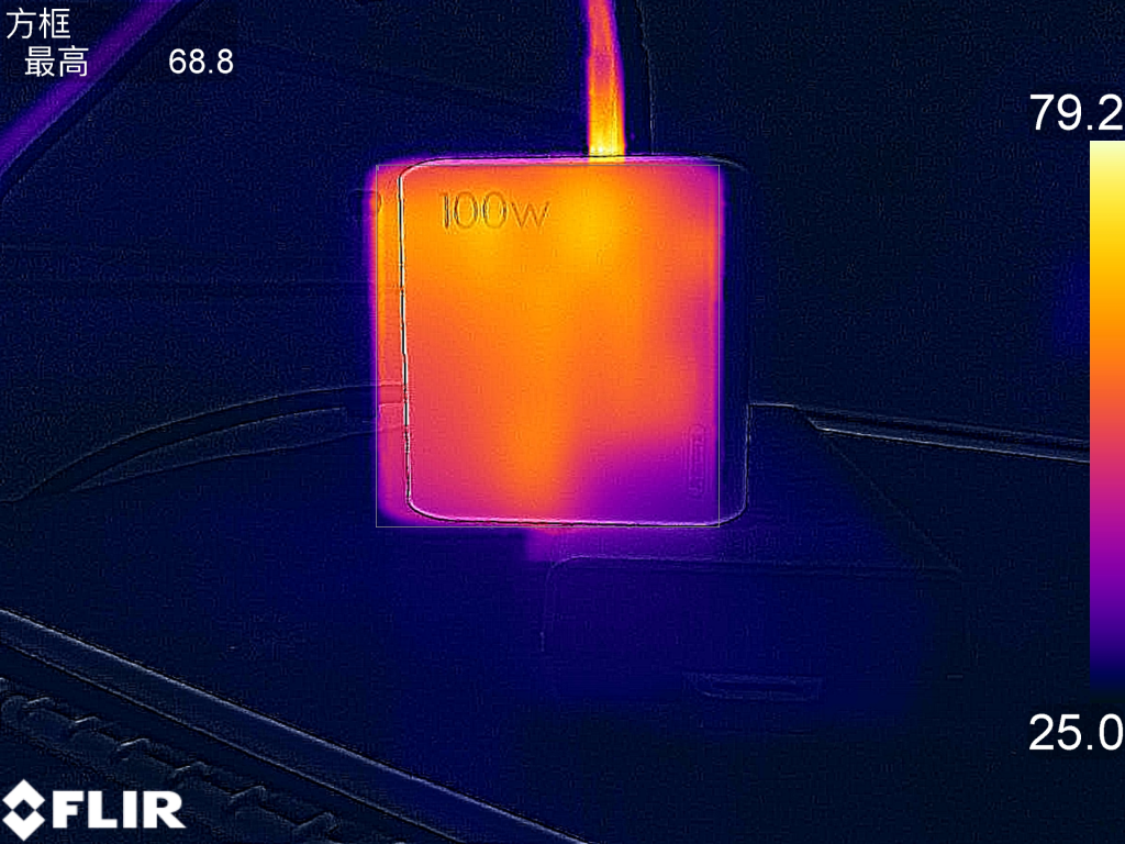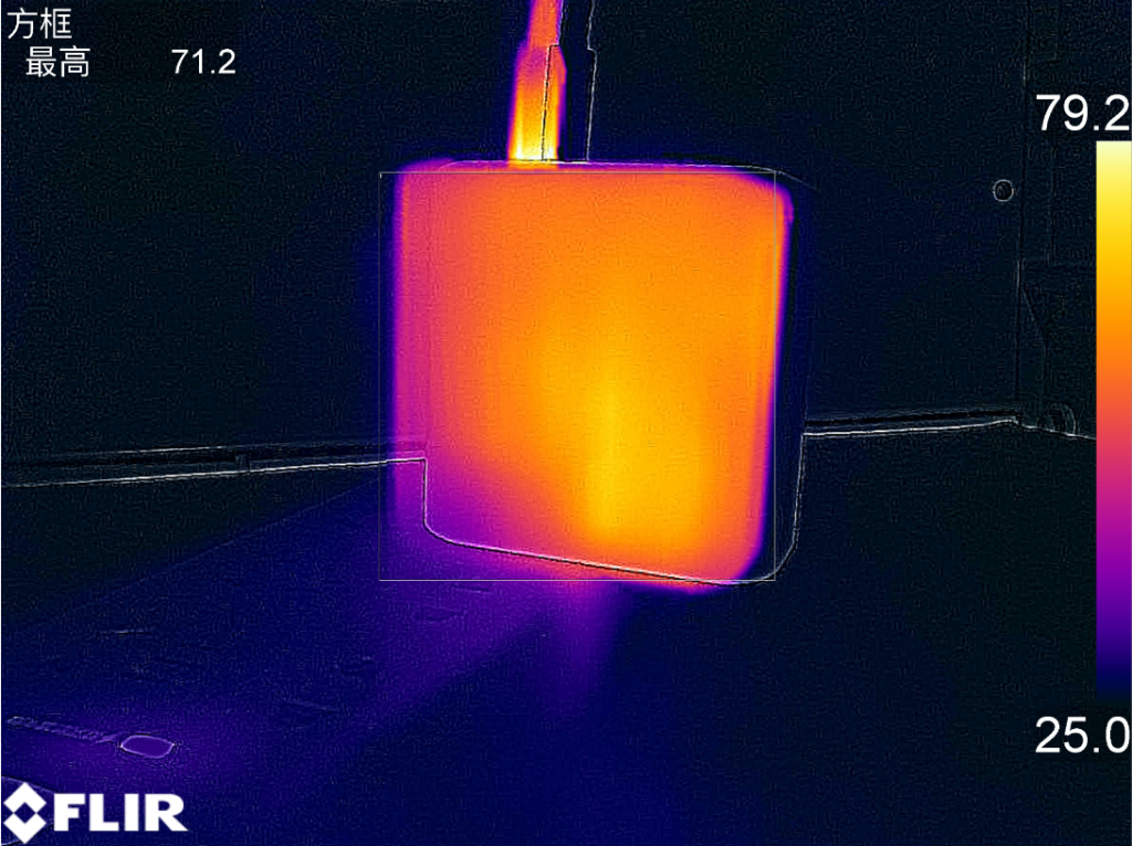 作为参照,满载一小时测试中,低功率密度的氮化镓充电器满载温度一般在60-70度之间,而高功率密度的单口氮化镓充电器一般在70度左右,高功率密度的多口氮化镓充电器温度一般都会超过70度。