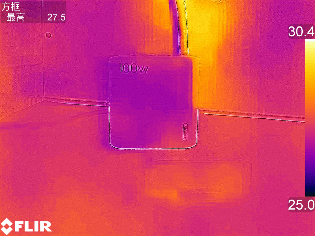 对充电器的温升进行测试,测试条件为在温度约为25℃的恒温箱中以20V 5A 100W的功率持续输出一小时的温升情况进行测试,准备开始测试前,充电器温度约为27.5℃。