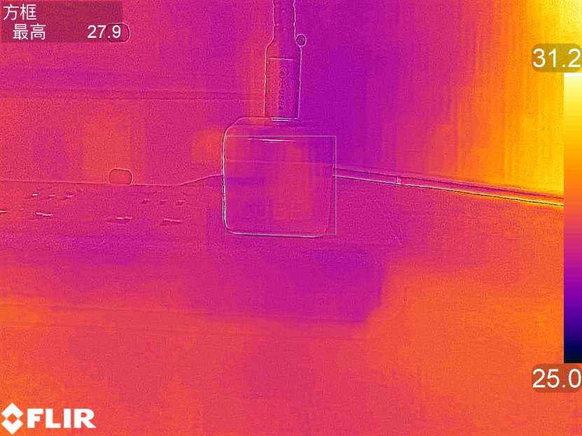 对充电器的温升进行测试,测试条件为在温度约为 25℃的恒温箱内以12V 1.66A 20W的功率持续输出一小时进行测试。准备开始测试前,最高温度为27.9℃。