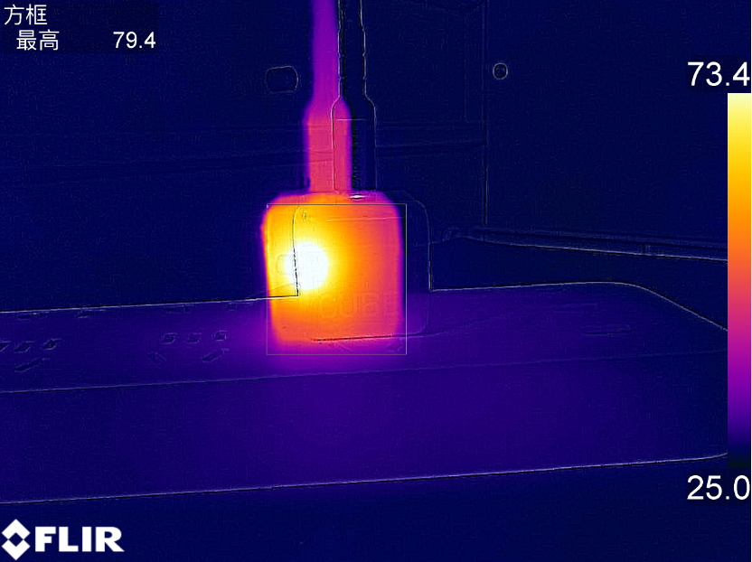 一小时后,当前最高温度为 79.4℃,主要集中在中部靠边位置。如此小的体积加上可折叠插脚,这个温度实属不易。