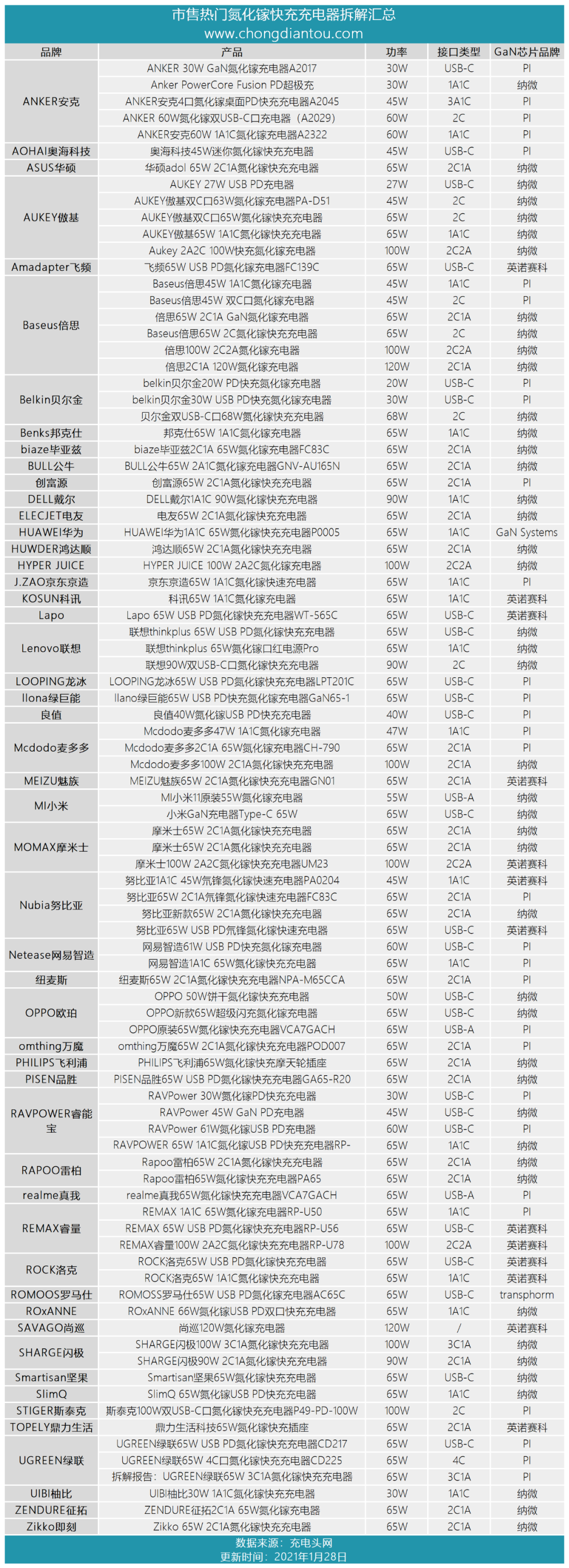 包括上文中提到的10家手机厂商推出的18款氮化镓快充充电器在内,充电头网还拆解了数十款主流品牌的氮化镓快充产品。以下整理了一张表格,记录了这些氮化镓快充充电器的简要信息。
