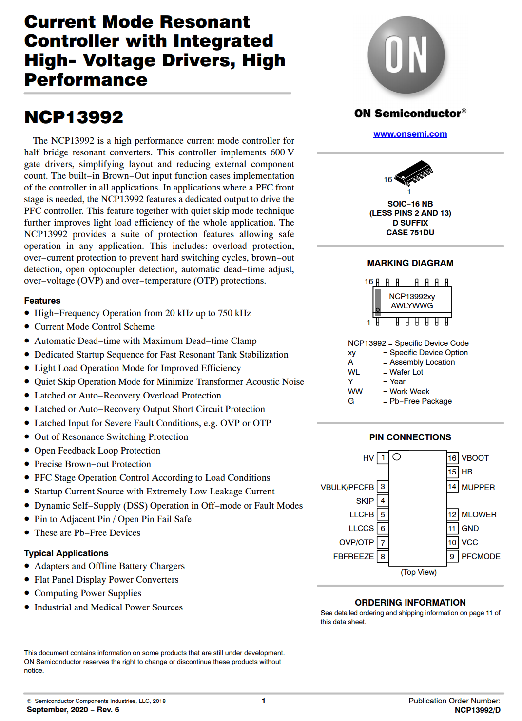 NCP13992是一款用于半桥谐振转换器的高性能电流模式控制器。此控制器内置600V门极驱动器,简化布局,减少了外部部件数量。在需要PFC前级的应用中,NCP13992可输出驱动信号控制PFC控制器。
