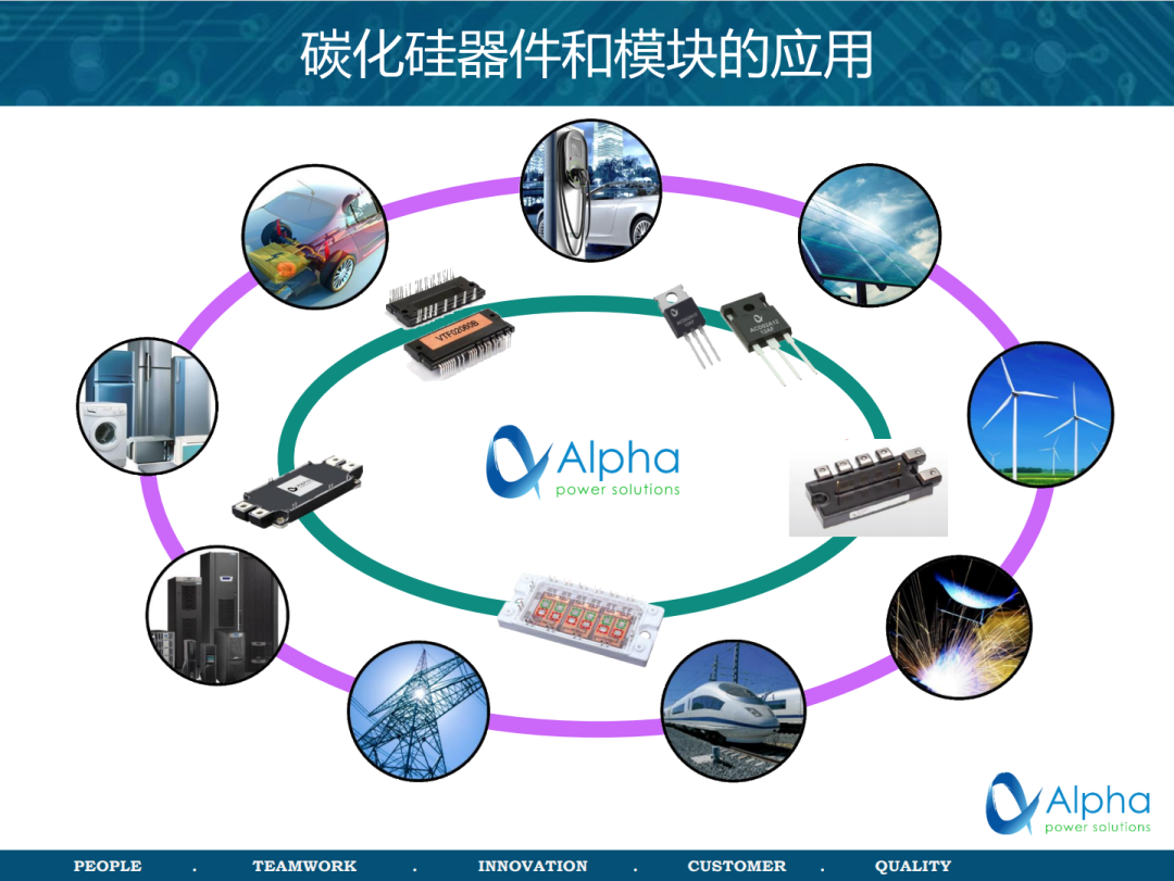 碳化硅器件和碳化硅模组可用于太阳能发电、风力发电、电焊机、电力机车、远距离输电、服务器、家电、电动汽车、充电桩等用途。