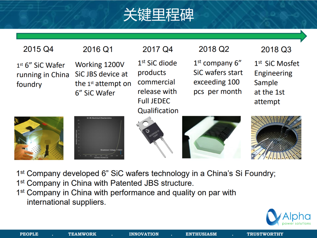 创能动力于2015年在国内开发出6英寸SiC制造技术,2017年推出基于6英寸SiC晶圆的SiC二极管,符合JEDEC标准,2018Q2每月生产超过100片6寸SiC晶圆,2019年在国内率先量产了车规级SiC二极管。SiC二极管可在更高的开关频率和更小的尺寸下提供更高效的解决方案,并提高效率和稳定性。