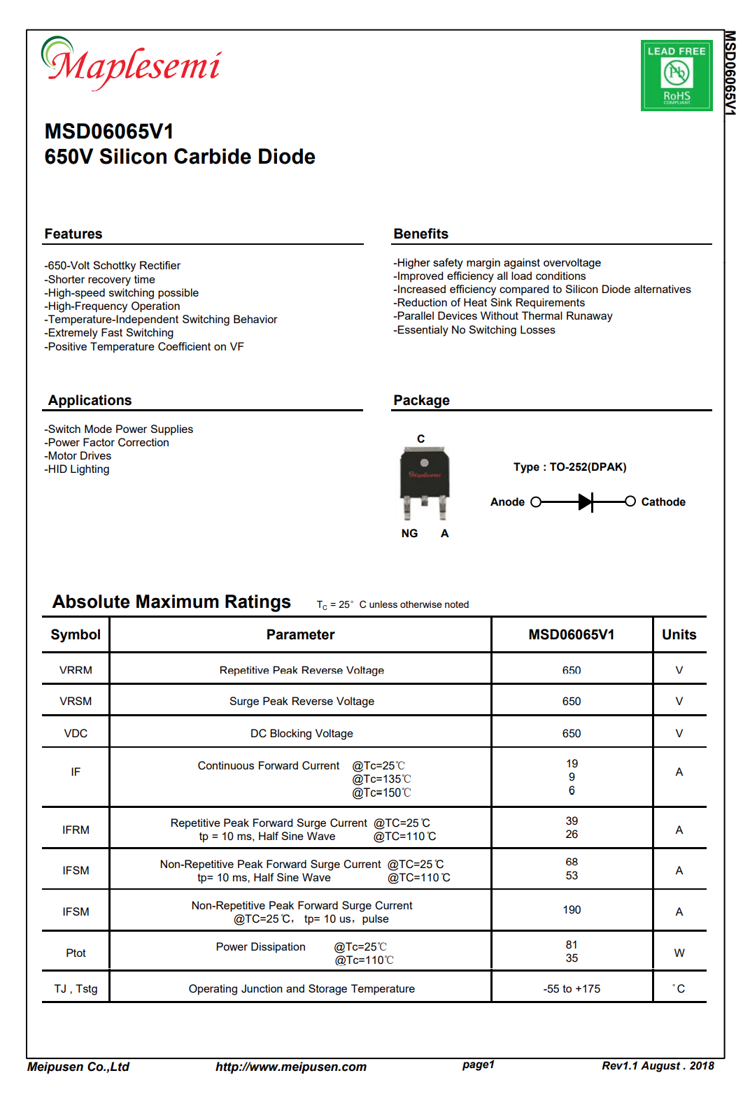 美浦森MSD06065V1 碳化硅二极管耐压650V,额定电流6A,采用TO252封装,支持高速开关和高频运行,并且具有正温度系数的压降。相比硅二极管提升效率,在全负载范围均可提高效率。