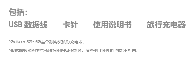 三星官网截图显示,三星S21的包装附件包含了USB数据线、卡针、使用说明书、旅行充电器;而备注信息显示三星S21+需要单独购买旅行充电器。